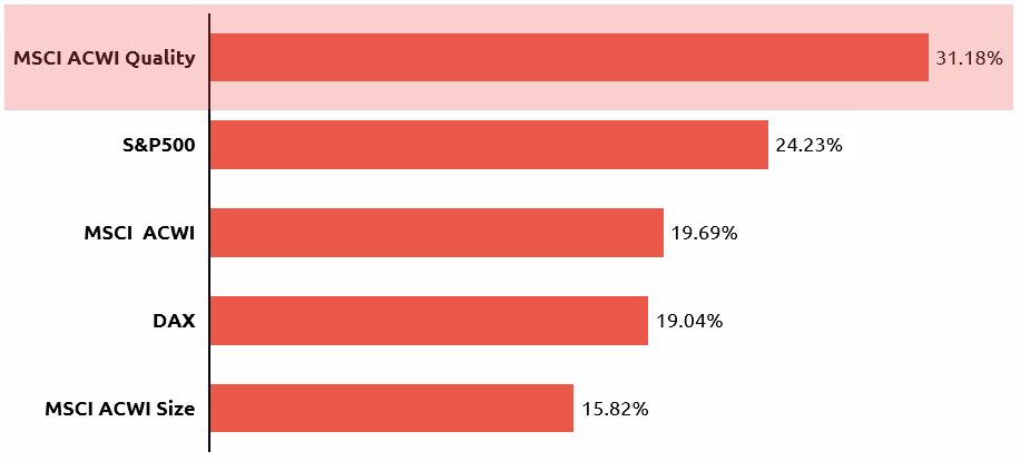 Consequently, it is unsurprising that investors continue their risk-averse behavior, following the trend of flight to quality – defensive investing in companies with durable business models and sustainable competitive advantages, meaning low leverage, stable earnings, and high profitability. A trend observable for the public markets where the clear factor-tilt of quality returned ~31% (MSCI ACWI Quality Index) in 2023 and strongly outperformed other indices like the world-covering index MSCI ACWI (~20%), the American S&P 500 (~24%), or the German DAX (~20%). As soon as the first interest rate cuts become tangible, we expect investor confidence to return and SMEs, listed and private, to catch up.