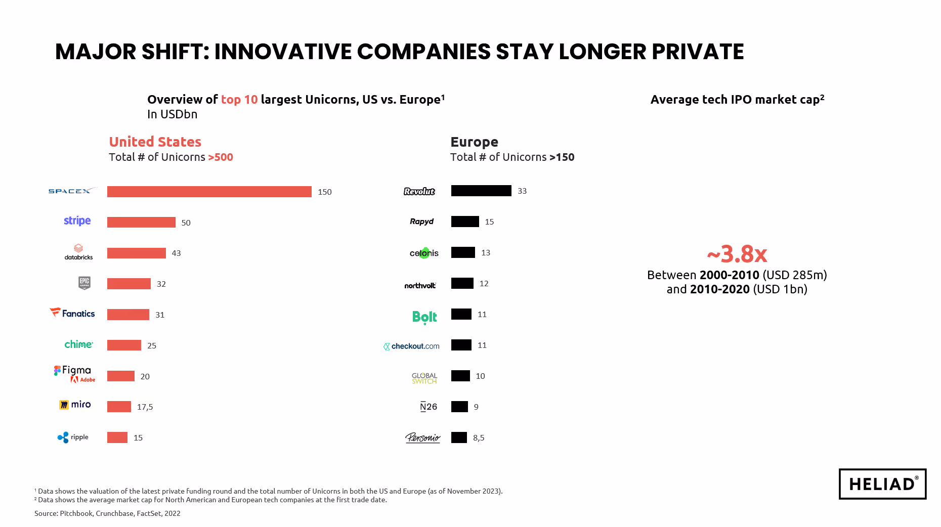 The current crisis-resistant cohorts indicate a strong quality for future sustainable value creation and inspire our view of the times ahead. Dry Powder remains near record high, indicating a temporary investment reluctance instead of missing funding volume. With flat or declining interest rates in 2024, we expect a significant rebound in VC deal activity. Regardless of the short- and mid-term macroeconomic difficulties, the long-term structural shift to a sustainable future with pioneering technologies generating large-scale impact at historical dimensions on our everyday lives, determining the VC case par excellence. More precisely, we are convinced that compared to the US, with 57% lower valuations across all stages, 2x more STEM students, and 1.7x more patent applications, Europe has great chances to lead the next wave of innovation and value creation. Check out our latest research “Unlocking European Growth Potential” to gain further insights into our conviction!